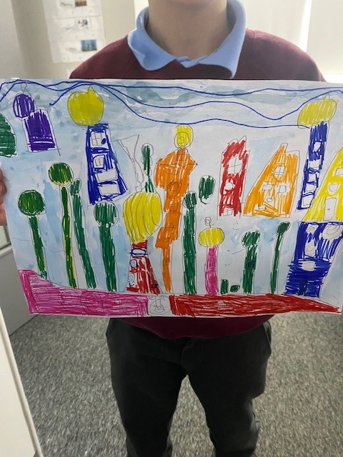 Today we took part in an online Art Lesson with Sinead from the Art and Design Factory. She told us all about the work of the artist Hundertwasser and showed us some of his famous paintings. Her lesson guided us through painting our own pictures in the same style he used. We followed her TEAMS lesson carefully! Have a look below at the beautiful pieces of work we produced.