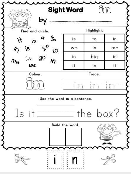 Today you are going to build the word "in". Can you use the word in a sentence? Write a sentence using the word you have built and read it to your grown up.✂️
