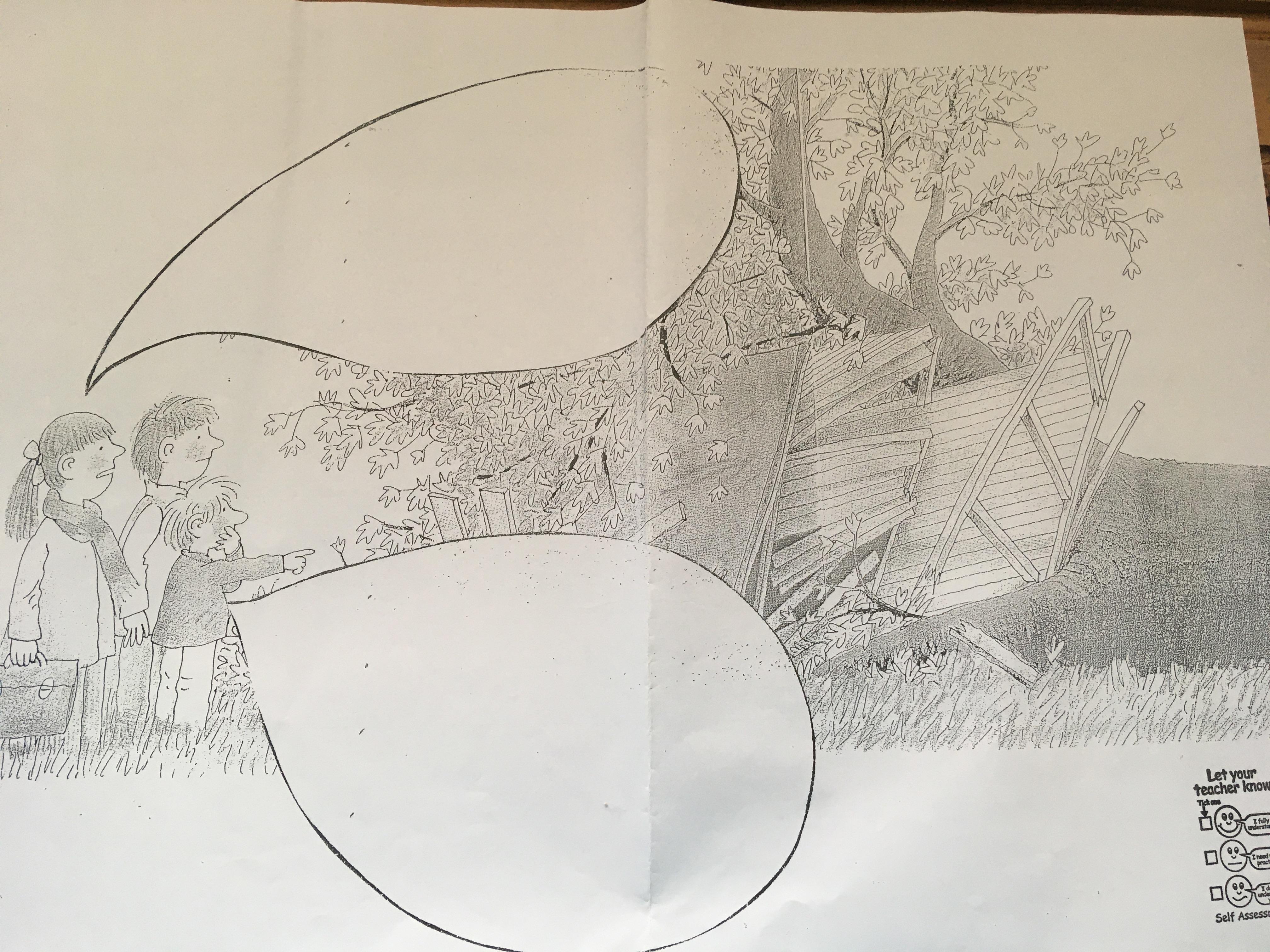 Today we are thinking about the story you have just heard. Have a look at the picture below and think about what the people are saying. We would like you to try to write the words that they are saying in the speech bubbles. If you don't have a printer, draw the picture yourself and make your own speech bubbles.