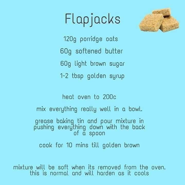 Have a go today at making flap jacks.  You can add raisins or sunflower seeds to the mixture as well!  Remember to ask your grown up��‍�� to help you measure out the ingredients⚖️ and when putting things into the oven or lifting them out as they will be very hot!��
