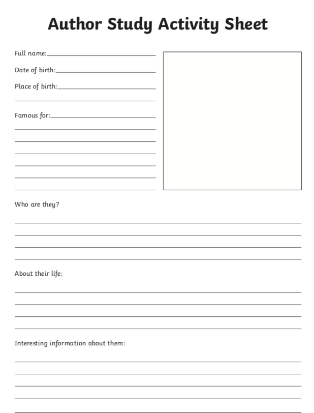 In this task we would like you to think of an author you are familiar with, one whose book or books you have read recently. For example, Roald Dahl, Jacqueline Wilson, Michael Morpurgo, Gillian Cross, David Walliams or JK Rowling. We would like you to carry out some research on one particular author and record your findings using the Author Study Activity Sheet. Investigate using Google or other appropriate search engine. Use your time wisely - you have two days to complete this task