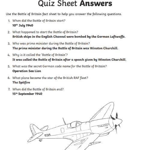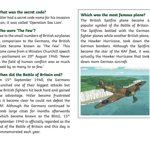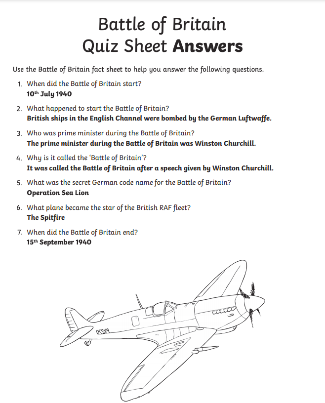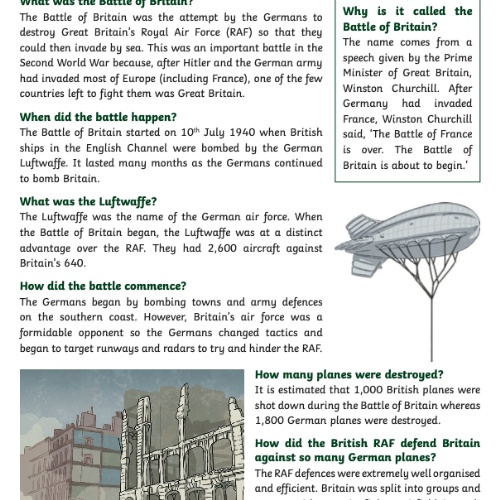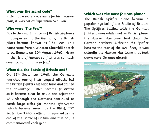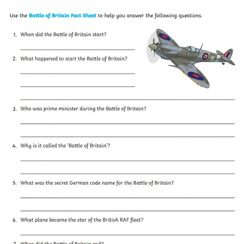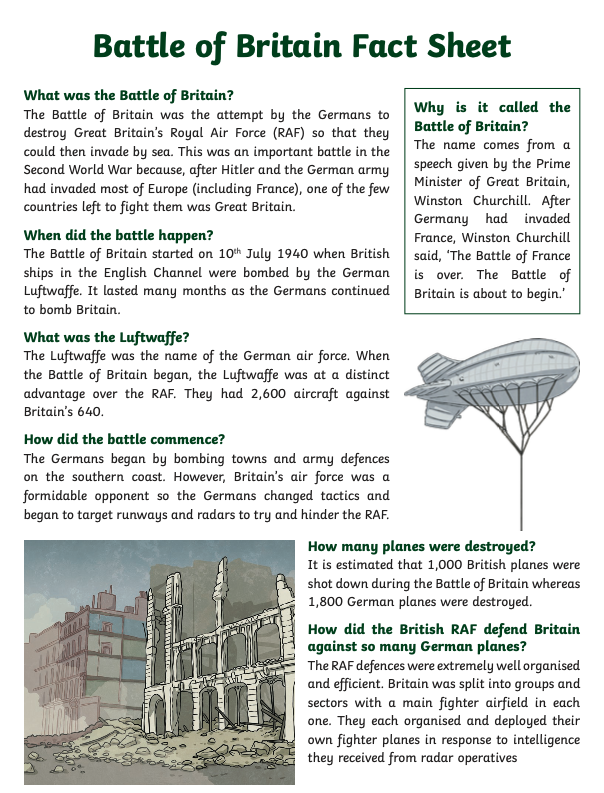 Below you will find a document called 'Battle of Britain Fact Sheet'. This is the main text. The PDF titled 'Battle of Britain Reading Activity' is where you will find the questions.