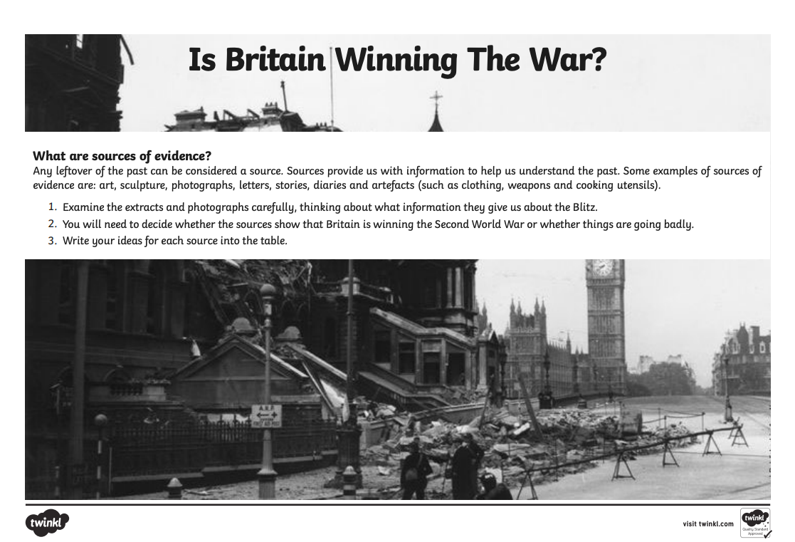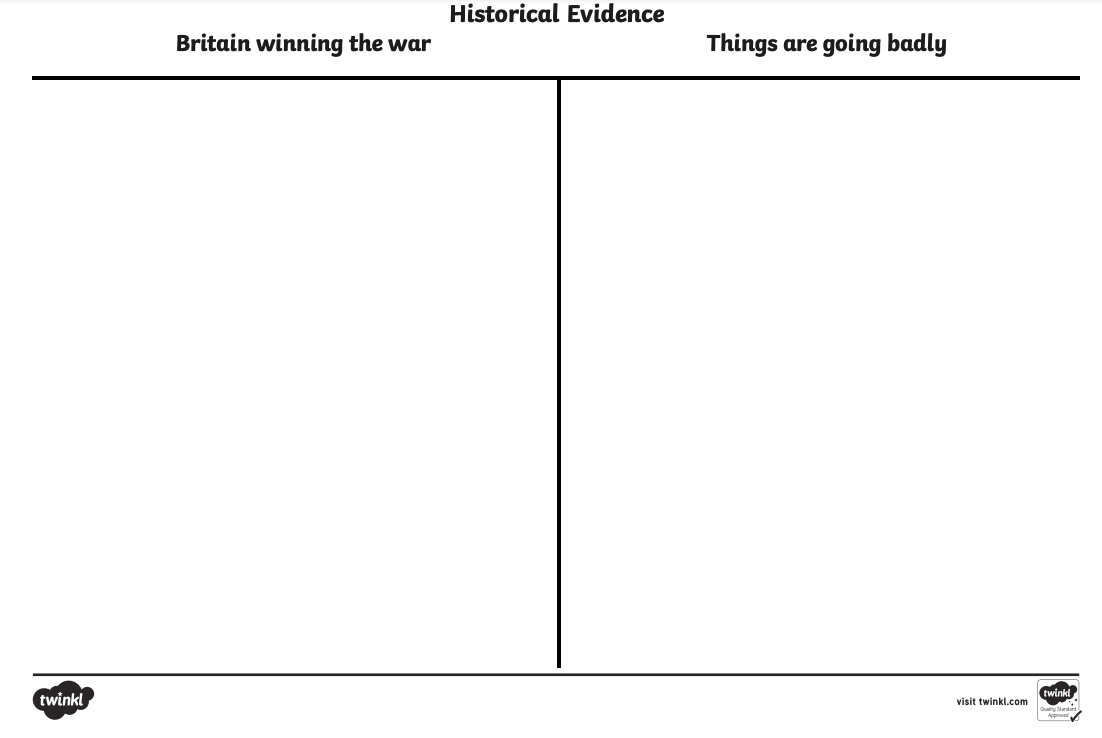 - On your recording sheet, decide which sources show that Britain is winning or losing the War, and give reasons for your decisions.