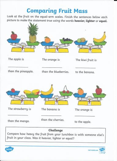 We can use our hands ✋ to compare the mass of an object. Have a look at the video and if you have some fruit at home, use it and see if you can estimate if the pieces of fruit are HEAVIER, LIGHTER or EQUAL by using your hands as scales.