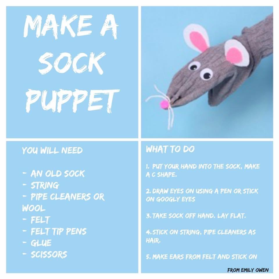 After working so hard all day it is now time to have even more fun. Have a look at what you need to make this super sock puppet. Take a photograph of it when it is finished and send it to your teacher.
