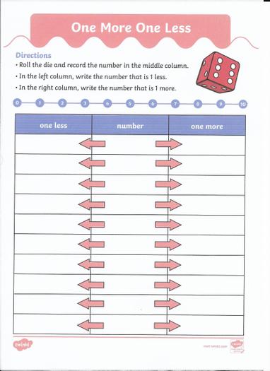 Simply roll the dice and write the number that is ONE LESS and the number that is ONE MORE than the number shown on the dice.