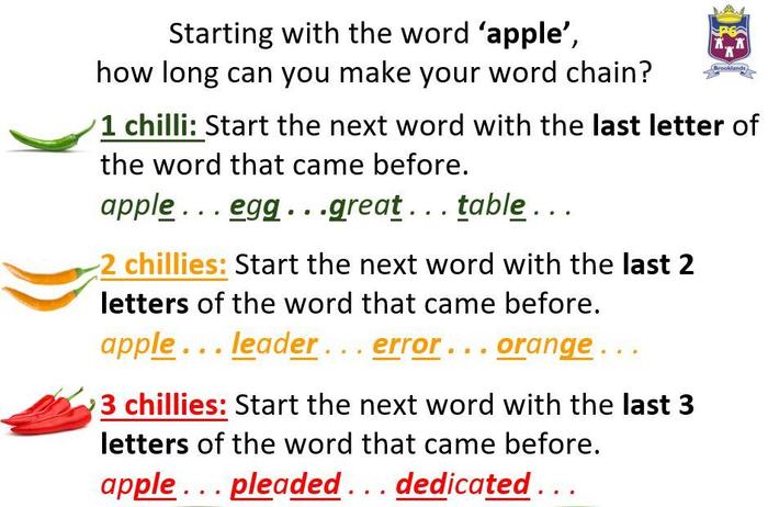 Let's begin by playing a word chains game! Beginning with the word "apple", how many words can you add to your chain? Choose your chilli challenge level and aim to create a chain with at least 12 words. Challenge someone else in your house to see who can create the longest word chain!
