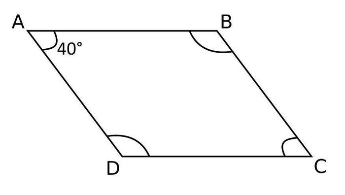 We can see that angle A = 40o.  Which angle is opposite angle A?  To find out, draw an imaginary diagonal line from angle A and you will arrive at angle C.  If opposite angles are equal, we now know that angle C = 40o too.