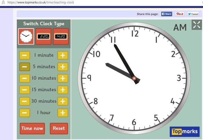 Now we are going to practise counting on in minutes and in hours. Watch today's video, download your activity and use this Top Marks Teaching Clock to help you work out the answers. Click on the clock to go straight to the Top Marks website.