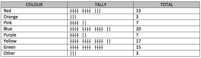 In the tally chart above, children have been asked to name their favourite colours. We use tally marks or "hashes" to record their answers and we organise these tally marks into groups of five. Once everyone has answered the question, we add up the tally marks to find the total or frequency.