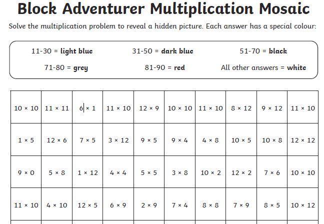 Let's practise our multiplication facts with today's mosaic activity. Work out the answers to these questions and then colour each square according to the answer key. Which character will you have built once you've finished?