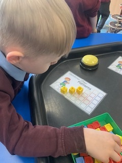 Today’s STEM activity was making patterns . We had to move coloured counters to make patterns- it sounds easy but we had to use our logic skills to move some coloured counters out of the way so that we could do what was asked of us!