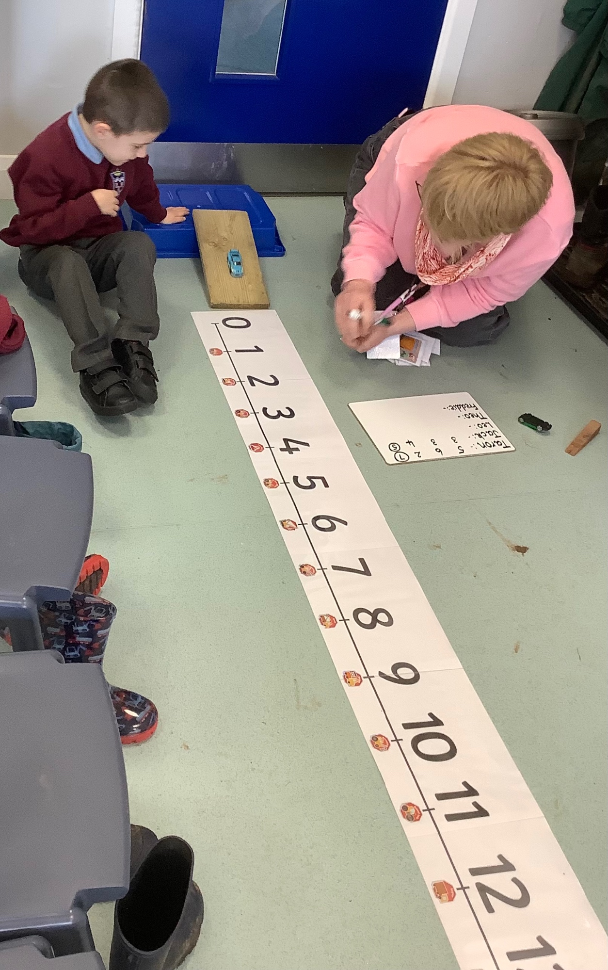 Today we have been taking part in a STEM activity. We have built a ramp by using a blue tray and a plank of wood. We then all picked a car from our class car box. We ran our car down the ramp and Mrs Massey noted how far along the number line the car travelled. We had to tell her the number that our car stopped at. We repeated this activity 4 times to see which was our best score. Some of us even got our car to race along as far as number 11. We then investigated how we could make our cars go further by changing the angle of the ramp. We also tried using different cars to see what happened then.