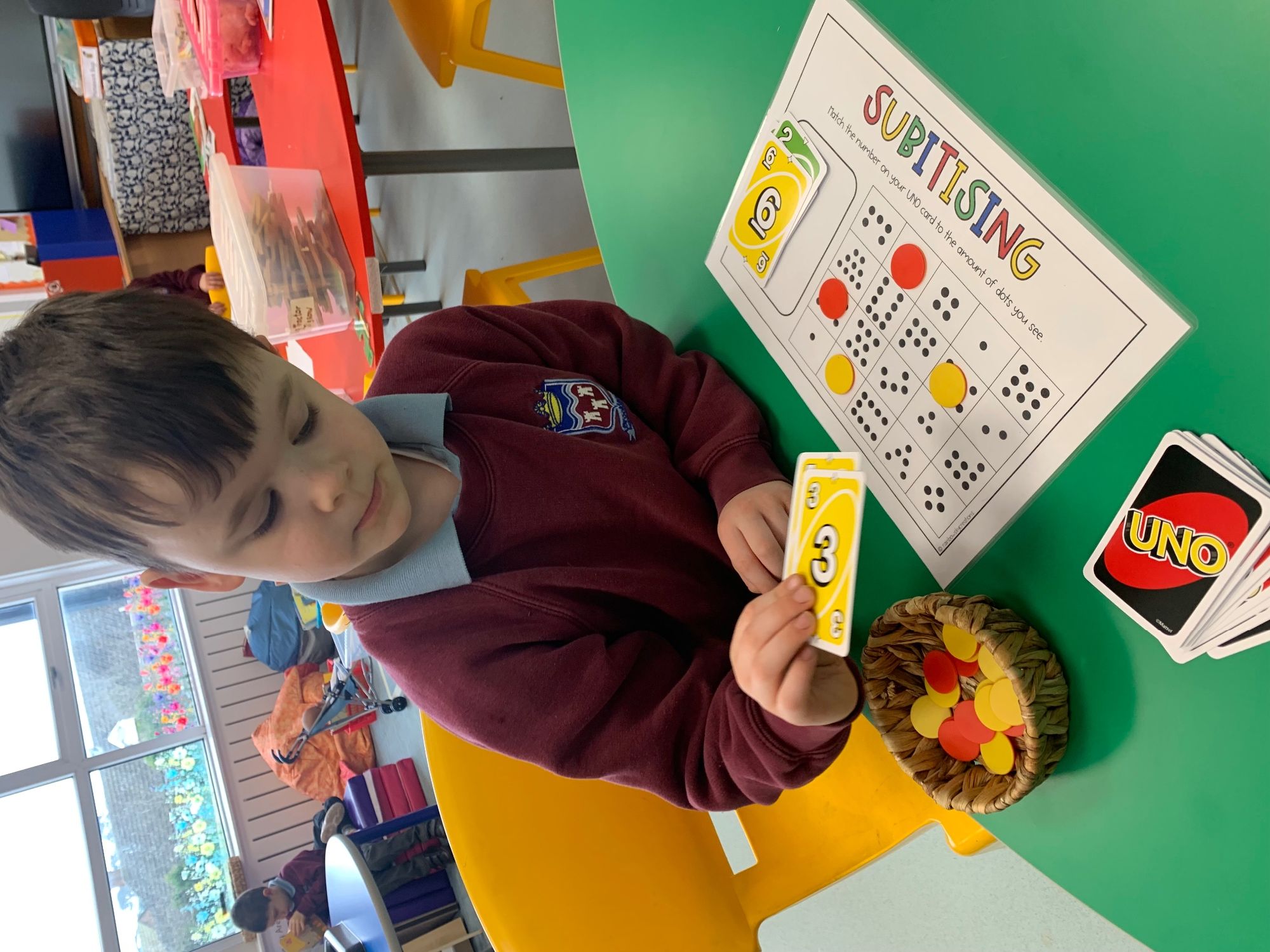 We have been playing a game of Uno Subitising. We had to turn over an Uno card, say the number on the card and then find it on the game board in dots. We then put a coloured counter on the square that it matched. If you turned over a card and there were no boxes left with that number on the board, we had to miss a turn. The winner was the person with the most coloured counters on the board.