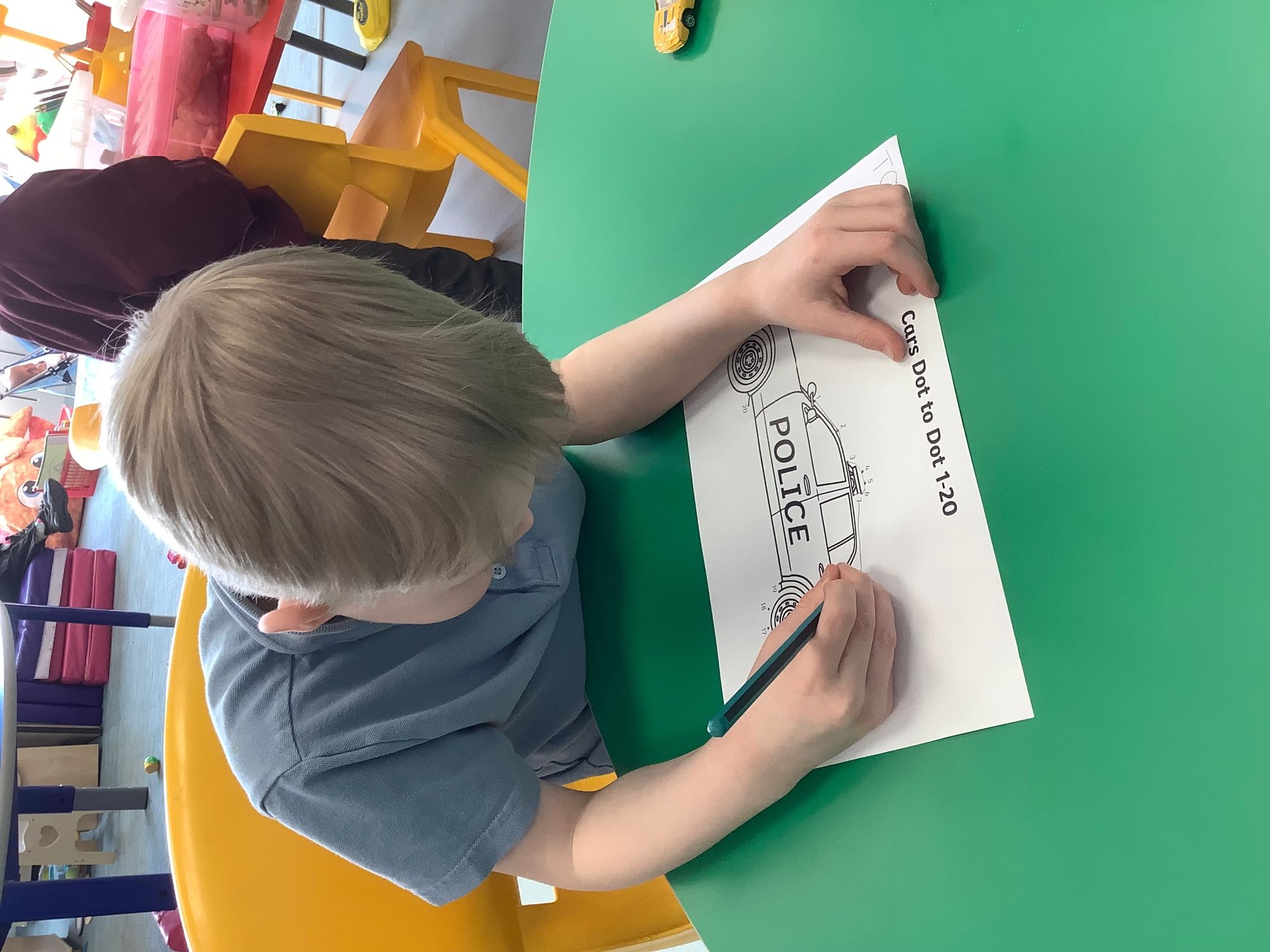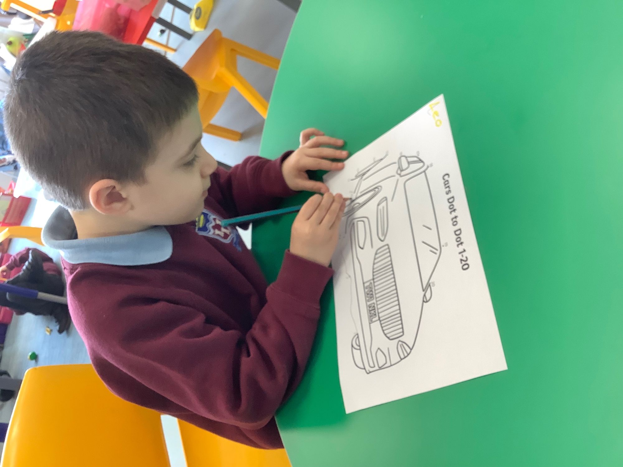 Today we had a go at a new activity. We worked hard with Miss Peacock and Mrs Todd to complete dot-to-dot activities. We each chose a picture of a vehicle and had to join the numbers in the correct order from 1 to 20. We had to think hard to count correctly and to recognise the numbers themselves.