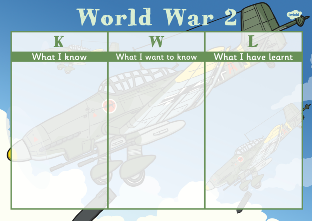 Jot down your thoughts on what you already know about World War 2 (the K section). You might want to ask an adult at home if they know of anyone in your family (possibly grandparents, great-grandparents, great aunts or great uncles) who played a role in the war, maybe as a soldier or as an evacuated child.