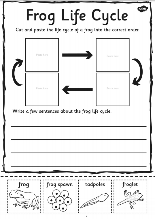 Firstly you will have to cut and stick the stages of a frog's life in the correct order, as well as writing a few sentences on this life cycle.