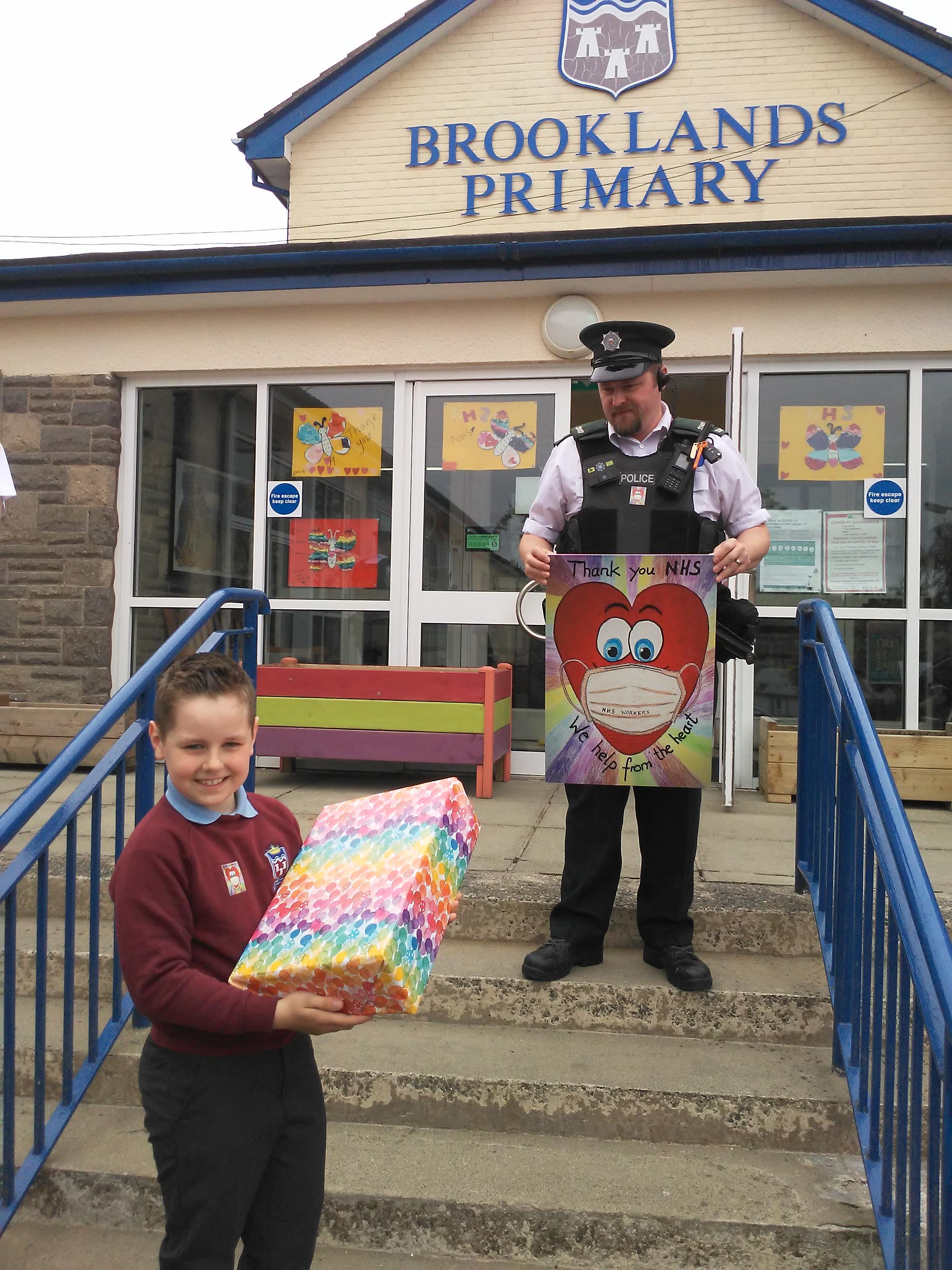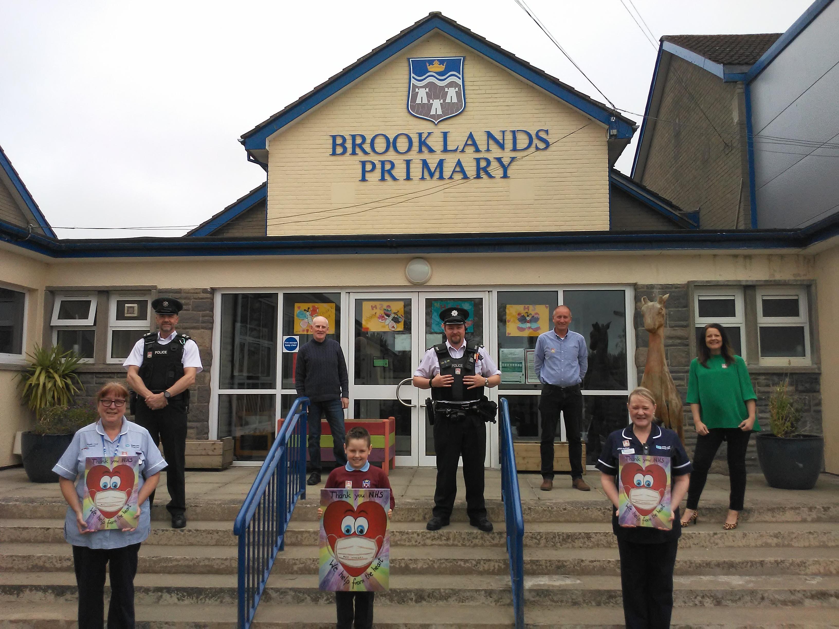 P5 pupil Jacob Jeska proudly shows off his winning design in the NHS Art Competition organised for primary schools in the Dundonald area in co-ordination with the PSNI and Ulster Hospital. His winning "We Help from the Heart" design will now feature on thousands of stickers to be worn by staff at the hospital. Presenting Jacob with a large portrait of his winning design and special gift are: (left to right) Patricia Anderson (Health Care assistant, Children's ward, Ulster Hospital), Sergeant Paul Marsh PSNI, Jacob's teacher Mr Devlin, Constable Alan McTier (PSNI), Mr Armstrong, Jenny Nicholson (E.D. Lead Nurse, Ulster Hospital) and Mrs Smart!