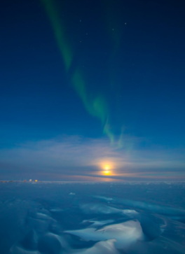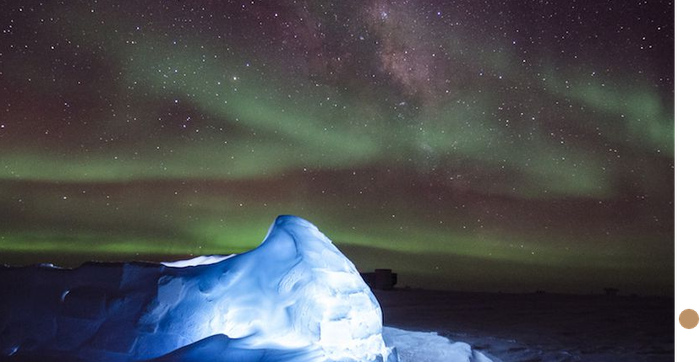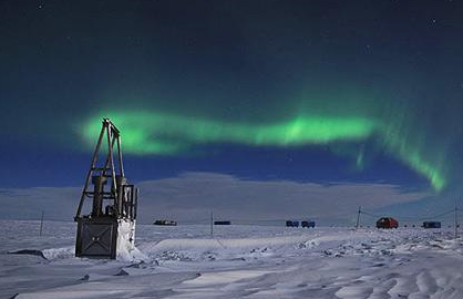 The amazing aurora australis can be seen above Halley Research Station on the Brunt Ice Shelf. The aurora are caused by charged particles from the Sun crashing into the upper atmosphere and are only visible near the Earth's poles.