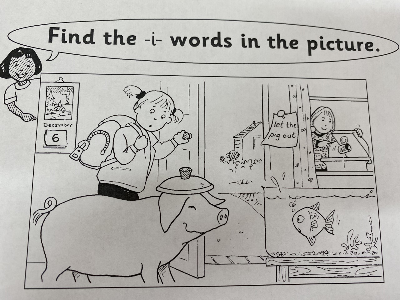 Write the words from the picture that have the "i" sound in the middle. Then write 1 sentence about the picture. Remember to start with a capital letter and finish with a full stop. Remember to spell your HFW correctly!