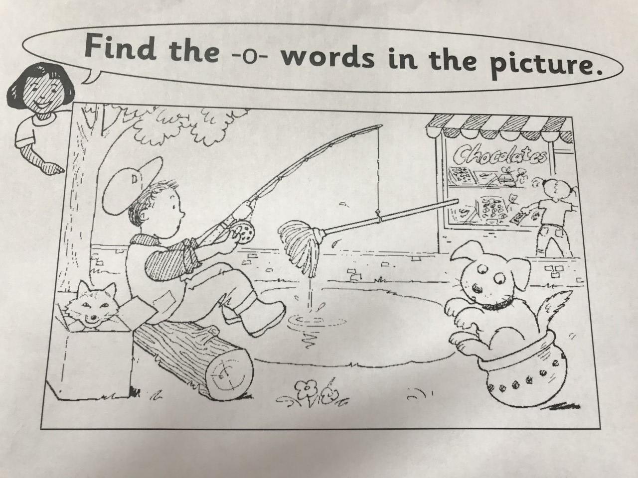 Write the words from the picture that have the "o" sound in the middle. Then write 1 sentence about the picture. Remember to start with a capital letter and finish with a full stop. Remember to spell your HFW correctly!